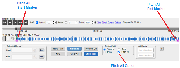 Several combination options are available for the redaction of recordings. Users can perform redaction on a recording and pitch-shift the entire recording, if they desire, while also redacting certain parts of the pitch-shifted recording with silence or tone.