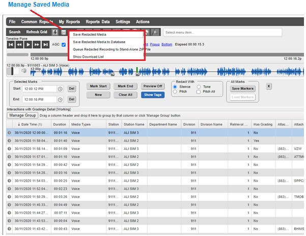 Redacted recordings can also be queued and then saved to a Stand-Alone ZIP file that includes the recordings and interaction data, and the software necessary to play back the recordings. After a recording has been redacted, click on the Manage Saved Media button in the Timeline Pane and select the Queue Redacted Recording to Stand-Alone ZIP File option. You can queue up any number of recordings as you redact them one at a time. When you have redacted all the recordings you need, click on the Manage Saved Media button and select Save Queued Recordings to Stand-Alone ZIP File.